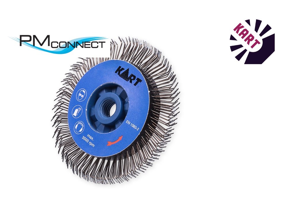Agresivní kotoučový kartáč o průměru 100 mm osazený ocelovým kaleným drátem s nabroušenými hroty o průměru 0,60 mm s upínacím otvorem M14.