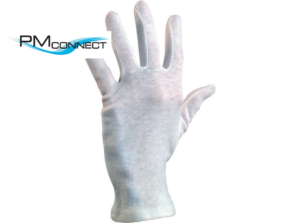 Textilní šité rukavice z běleného bavlněného úpletu, střih fourchette. Doporučené aplikace: manipulace s lehkým a drobným materiálem, zemědělství, automobilový průmysl, jemná montáž, číšníci, numismatici, pracovníci v muzeích, vhodné také pro práci vyžadující ochranu produktu před znečištěním.Doplňkové parametry