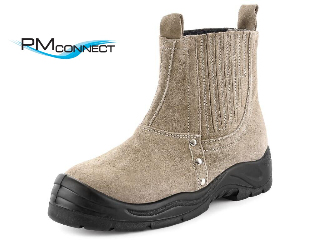 Celokožená kotníková obuv s krytou pružinkou. Materiál: svršek z kvalitní 2 - 2,2 mm hrubé hovězí broušené kůže, krytá gumová pružinka pro rychlé vyzutí, podšívka: 1,2 - 1,4 mm hovězí broušená kůže, podešev: PU-guma, antistatická, olejivzdorná, protiskluzová, odolná vůči kontaktnímu teplu do 300 °C.Doplňkové parametry