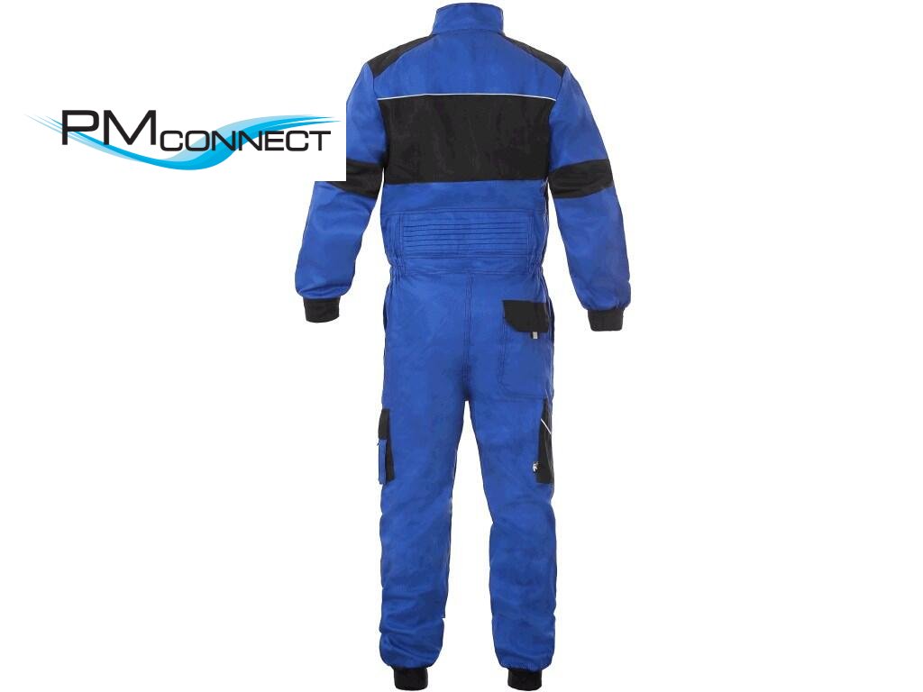 >Pánská montérková kombinéza, kryté zapínání na zip a suché zipy, dvoucestný zip, rukávy s pružnou manžetou, náprsní kapsy s klopami, skrytá náprsní kapsa na zip, přední kapsy, boční kapsa na svinovací / skládací metr, boční kapsa na mobil / peněženku, zdvojená kolena, pruženka v bederní části, zadní kapsa s klopou, reflexní doplňky. Doporučené použití: stavebnictví, lehký průmysl, logistika, skladová manipulace, autoservisy, údržba, montáže, zemědělství, zahrada, hobby.