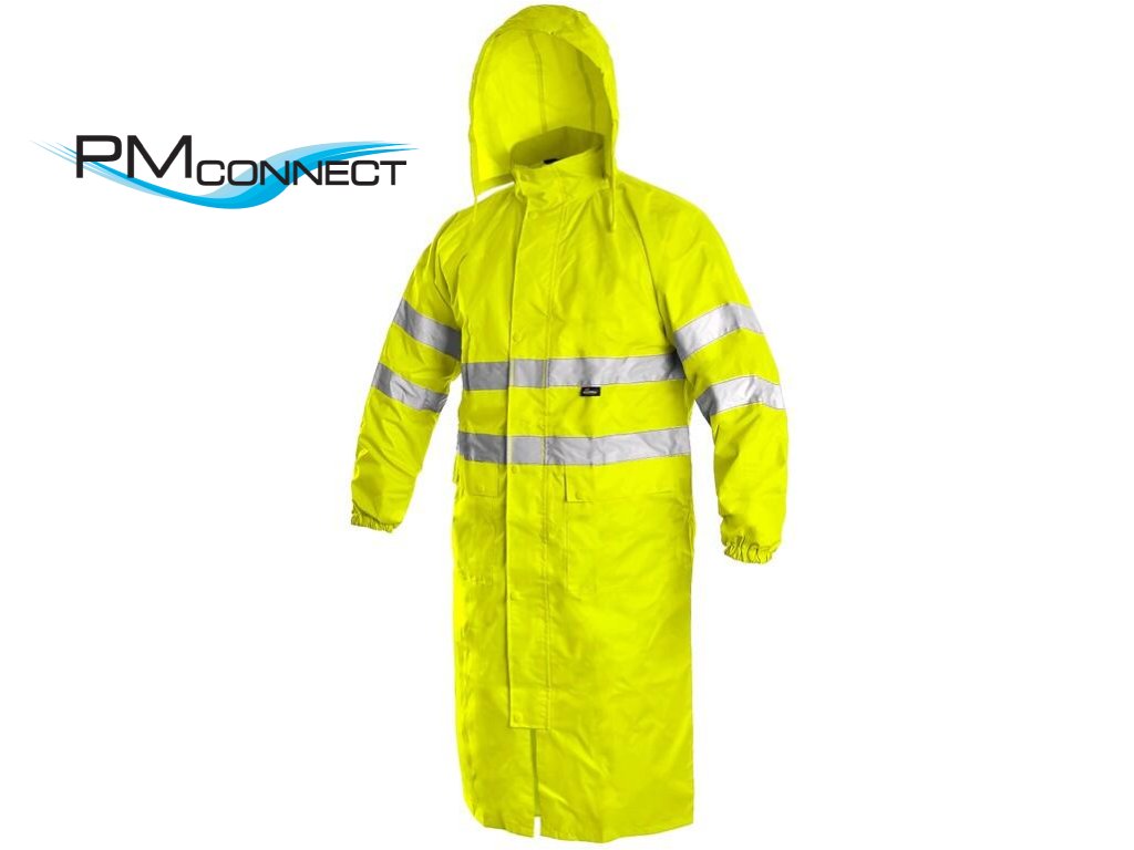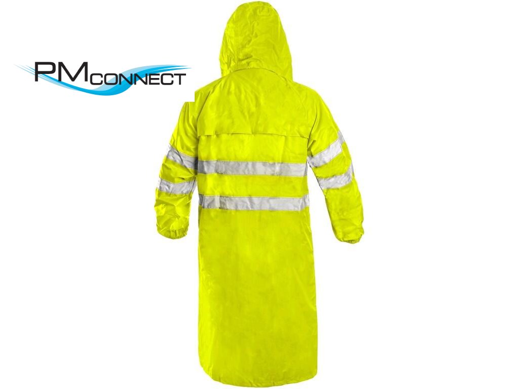 Výstražný plášť s reflexními pruhy, nepromokavý, lepené švy, odepínací kapuce v límci, zapínání na zip krytý légou, raglánové rukávy v manžetě do gumy, dvě spodní kapsy s patkou, větrání na zádech a v podpaží. Plášť je složen v praktickém balení na zip. Délka pláště 120 cm.Doplňkové parametry