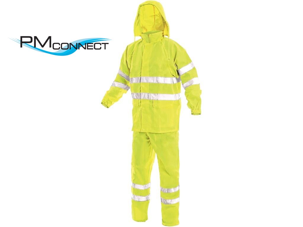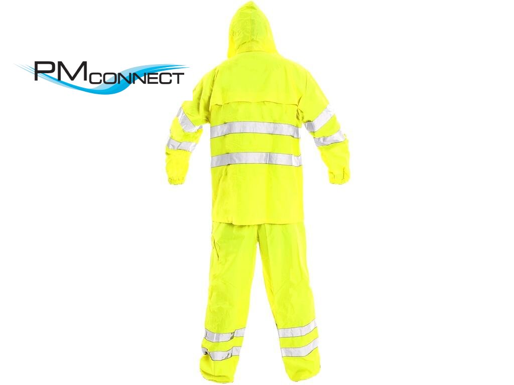 Výstražný oděv s reflexními pruhy, nepromokavý, lepené švy, kapuce v límci, bunda na zip ktytý legou, raglánové rukávy v manžetě do gumy, dvě spodní kapsy s patkou. Kalhoty v pase do gumy, dvě boční kapsy, šířka nohavic regulovatelná cvoky. Oblek je složen v praktickém balení. Doporučené použití: stavebnictví, silničáři, řidiči, logistika, údržba, popeláři, automyčky, chemické postřiky, mokré prostředí.Doplňkové parametry