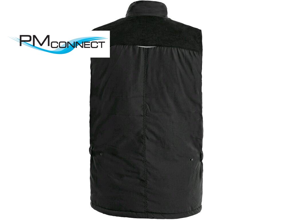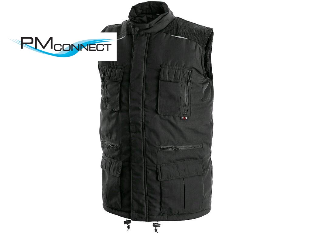 Pánská zateplená vesta, ramena a límec pošitý manšestrem, pružné stažení průramku, zapínání na zip krytý légou, stahování v dolním okraji, 8 vnějších kapes, reflexní doplňky, vnitřní kapsa na zip.Doplňkové parametry
