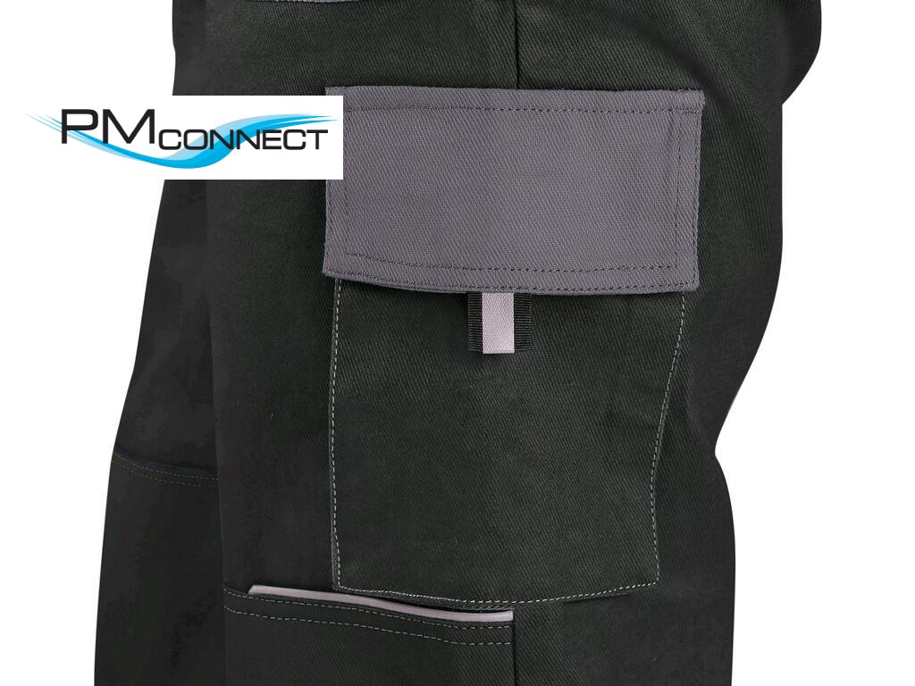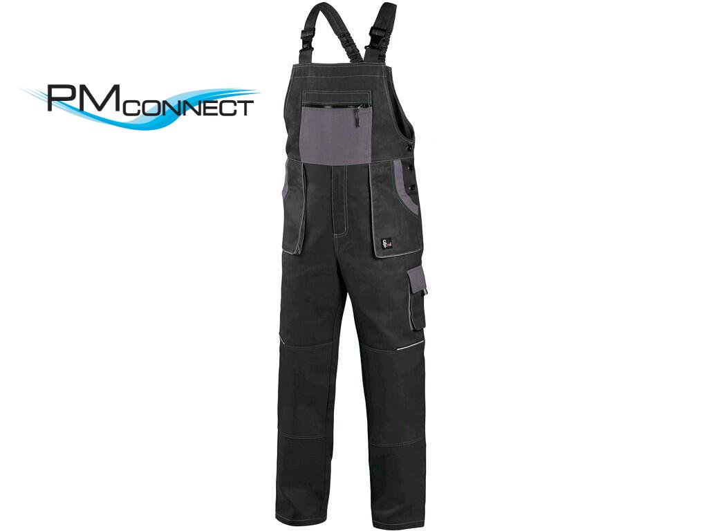 Pánské montérkové kalhoty s náprsenkou, náprsní kapsa na zip, pas vzadu do gumy, přední kapsy, boční kapsa na svinovací / skládací metr, boční kapsa na mobil / peněženku, zdvojená kolena, zadní kapsa s klopou, šle s gumou vzadu, reflexní doplňky. Doporučené použití: stavebnictví, lehký průmysl, logistika, skladová manipulace, autoservisy, údržba, montáže, zemědělství, zahrada, hobby.Doplňkové parametry