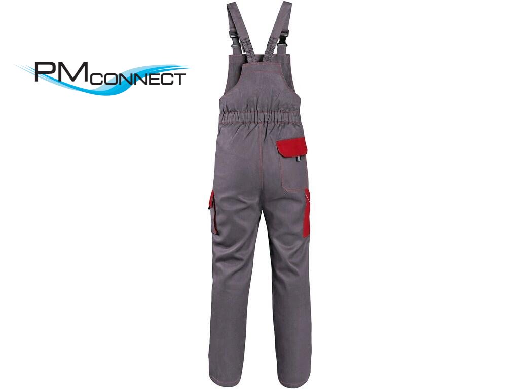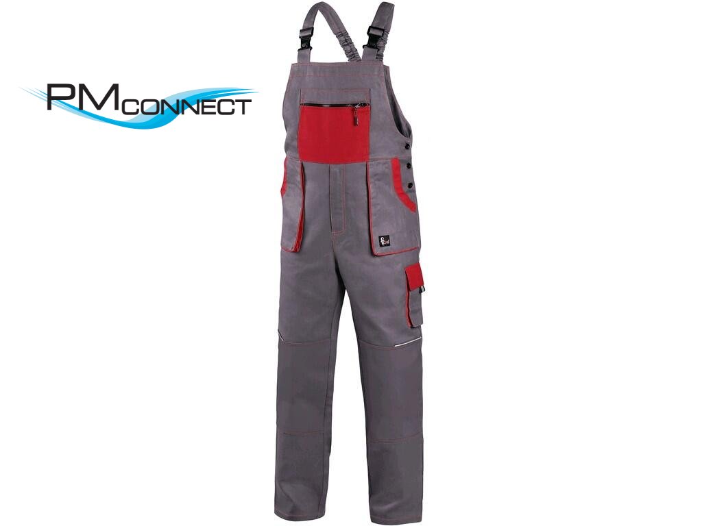 Pánské montérkové kalhoty s náprsenkou, náprsní kapsa na zip, pas vzadu do gumy, přední kapsy, boční kapsa na svinovací / skládací metr, boční kapsa na mobil / peněženku, zdvojená kolena, zadní kapsa s klopou, šle s gumou vzadu, reflexní doplňky. Doporučené použití: stavebnictví, lehký průmysl, logistika, skladová manipulace, autoservisy, údržba, montáže, zemědělství, zahrada, hobby.Doplňkové parametry