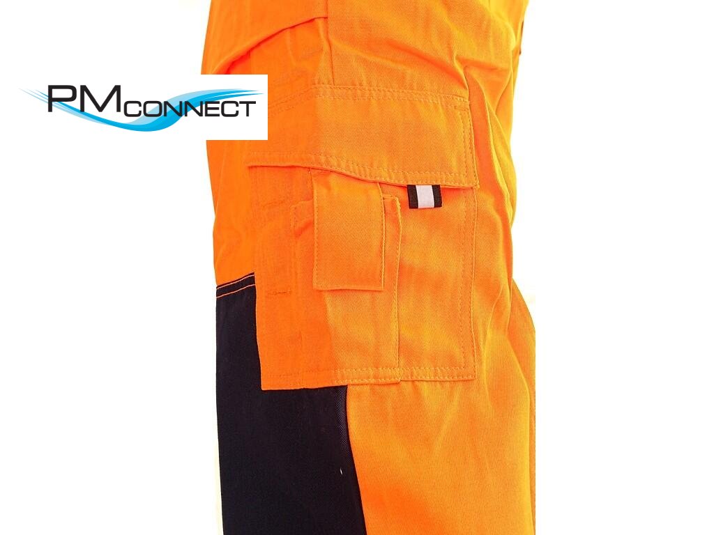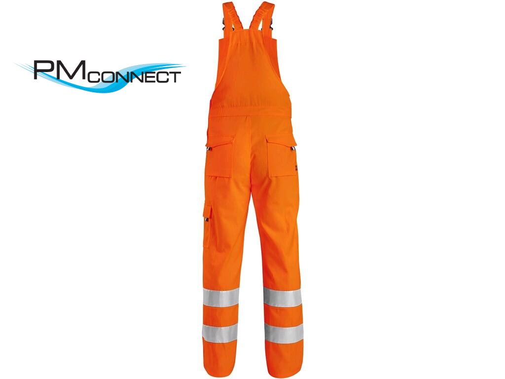 Pánské výstražné kalhoty s náprsenkou, šle s gumou vzadu, náprsní kapsa na suchý zip s menší kapsou na tužku, 2 přední kapsy, 2 zadní kapsy s patkou na suchý zip, kryté přední zapínání na zip, boční zapínání na knoflíky, levá boční kapsa s menší kapsou na tužku, 3M reflexní pásky (šíře 7 cm). Doporučené použití: stavebnictví, silničáři, řidiči, údržba, logistika, letecká a lodní doprava, popeláři, záchranáři.Doplňkové parametry