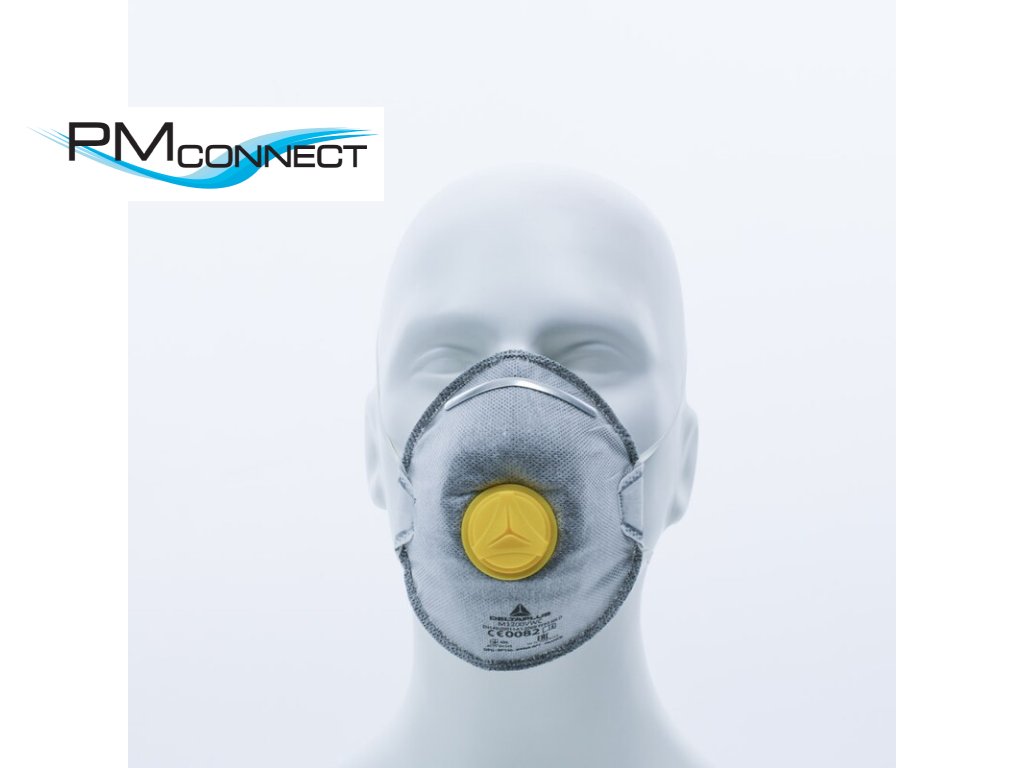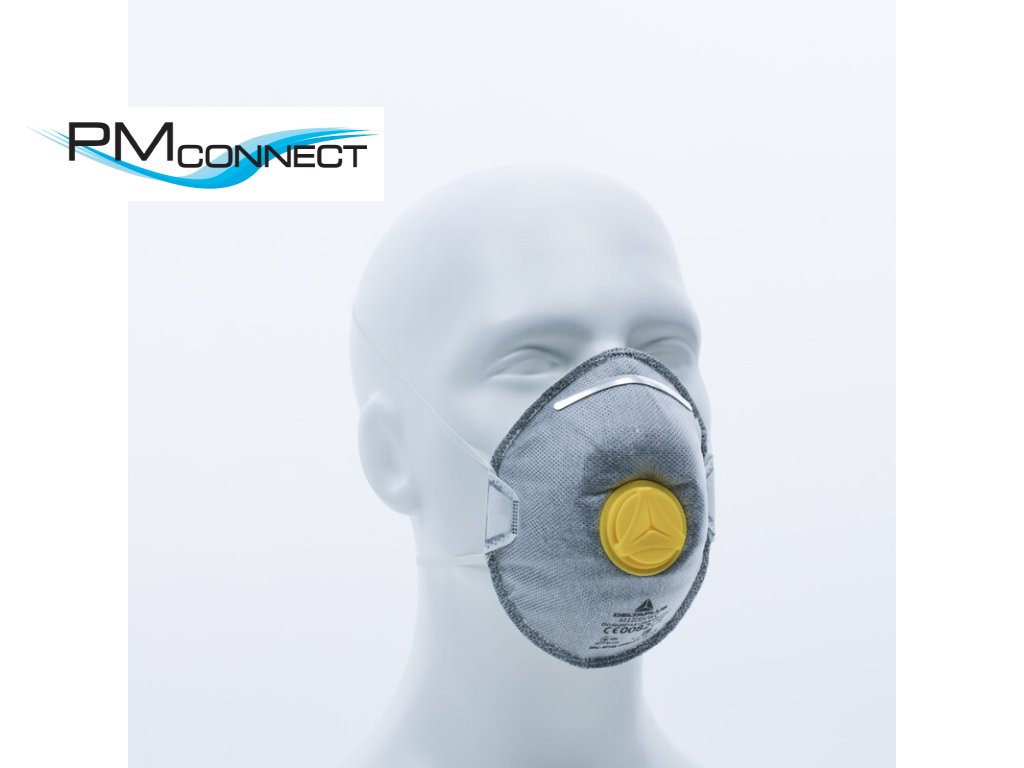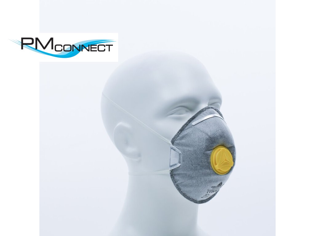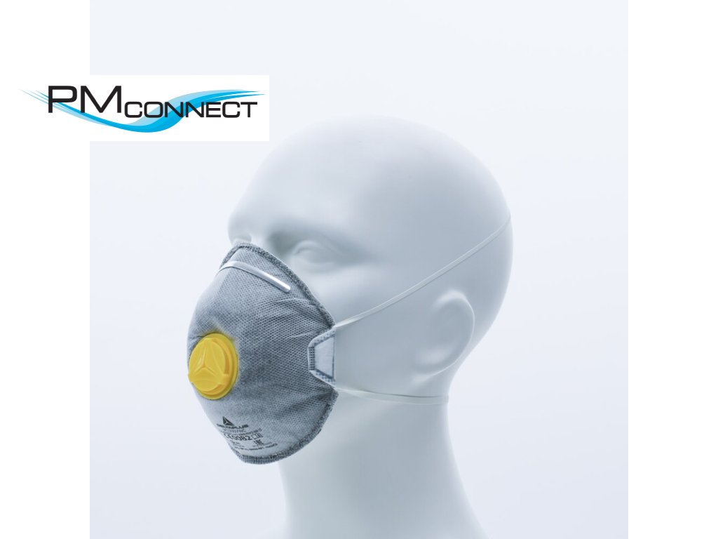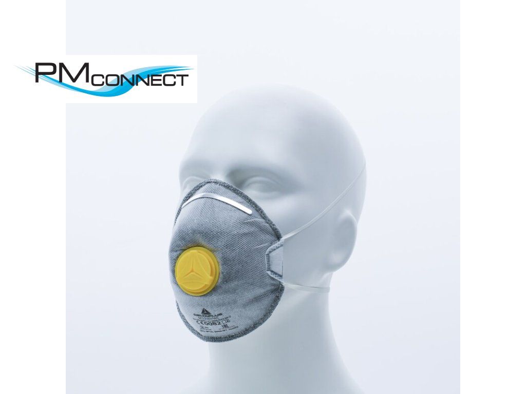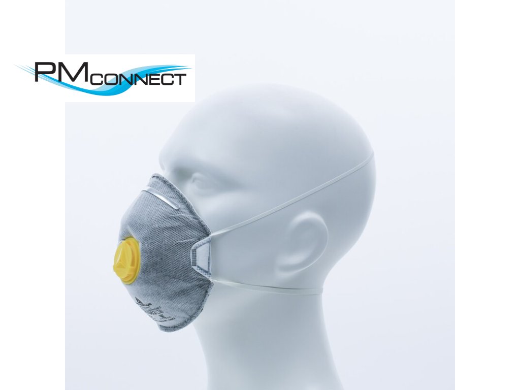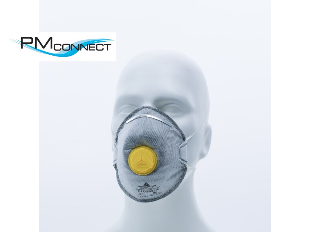 Jednorázová dýchací maska P2 blokující pachy, s ventilemMateriál : Aktivní uhlí - Syntetická netkaná textilie - Pěnové | Nosní klip : Ocel | Upevnění : Příruby | Krabice po 10