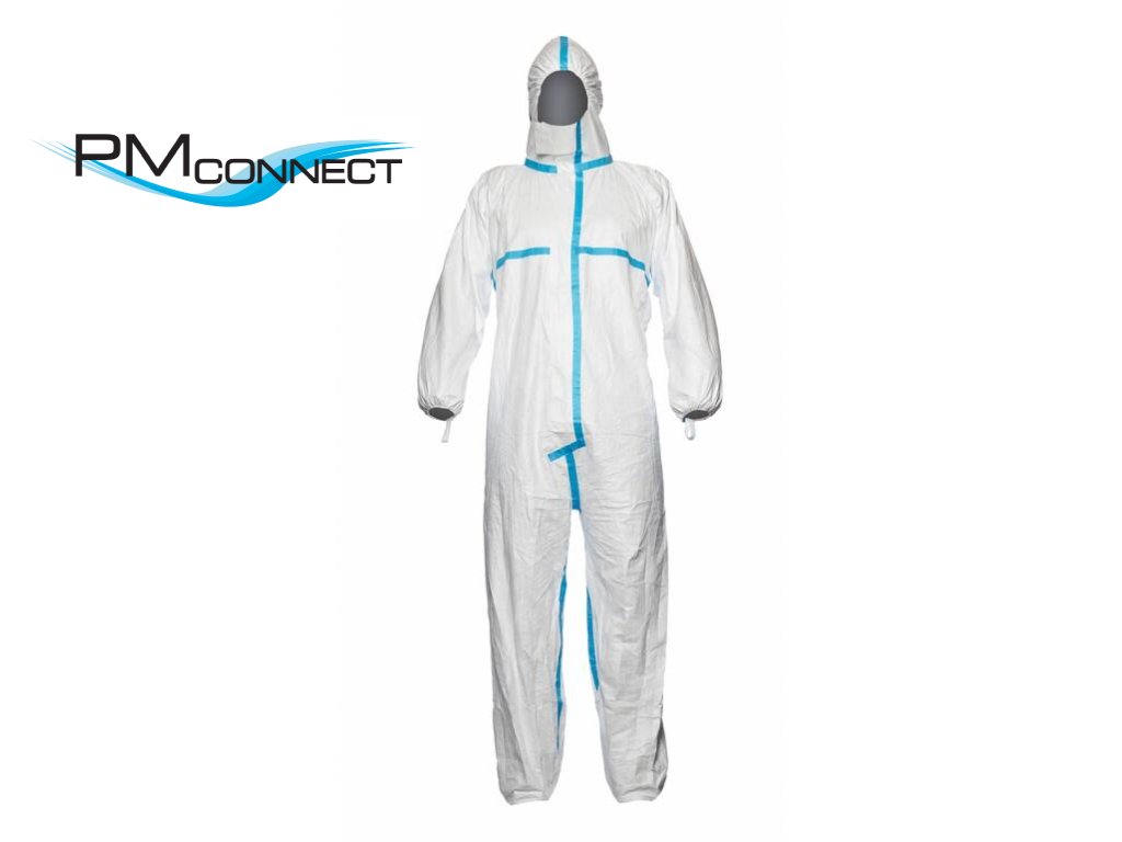 Jednorázový ochranný oděv s kapucí a přelepenými švy, antistatický, bez silikonů, kat. III, typ 4B, 5B a 6B. Ochrana proti vodě, roztokům chemikálií, azbestu a prachu.Doplňkové parametry