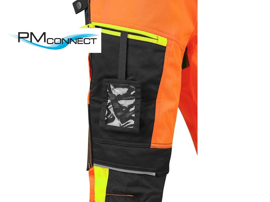 Pánské výstražné kalhoty, pas s poutky na opasek a gumou v bocích, 2 přední kapsy, 2 zadní kapsy, jedna s klopou, kryté přední zapínání na zip, boční multifunkční kapsy, stehenní zipová kapsa s vnitřním pouzdrem na ID kartu, kolena zesílena materiálem CORDURA s možností vložení kolenních výztuh, spodní část nohavic vyztužena materiálem CORDURA, segmentované reflexní pásky (šíře 7 cm), kontrastní žluté/oranžové a reflexní doplňky. Doporučené použití: stavebnictví, silničáři, údržba, logistika, letecká a lodní doprava.Doplňkové parametry