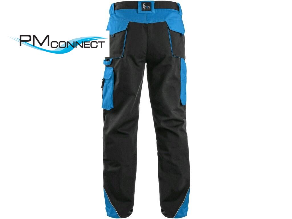 Pánské montérkové kalhoty, pas s poutky na opasek a gumou v bocích, přední klínové kapsy, multifunkční kapsy na obou stranách, kolena zesílena materiálem 600D polyesterem s možností vložení kolenních výztuh, dvě zadní kapsy s klopami, reflexní doplňky. Doporučené použití: stavebnictví, strojírenství, lehký průmysl, práce na silnici, odtahové služby, automobilový průmysl, logistika, skladová manipulace, spedice, autoservisy, údržba, montáže, zemědělství, zahrada, hobby.Doplňkové parametry