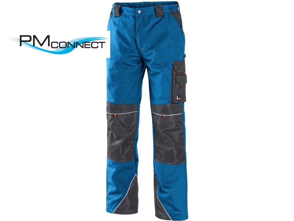 Pánské montérkové kalhoty, pas s poutky na opasek a gumou v bocích, přední klínové kapsy, multifunkční kapsy na obou stranách, kolena zesílena materiálem 600D polyesterem s možností vložení kolenních výztuh, dvě zadní kapsy s klopami, spodní část nohavic vyztužena materiálem 600D polyester, reflexní doplňky. Doporučené použití: stavebnictví, strojírenství, lehký průmysl, automobilový průmysl, logistika, skladová manipulace, spedice, autoservisy, údržba, montáže, zemědělství, zahrada, hobby.Doplňkové parametry