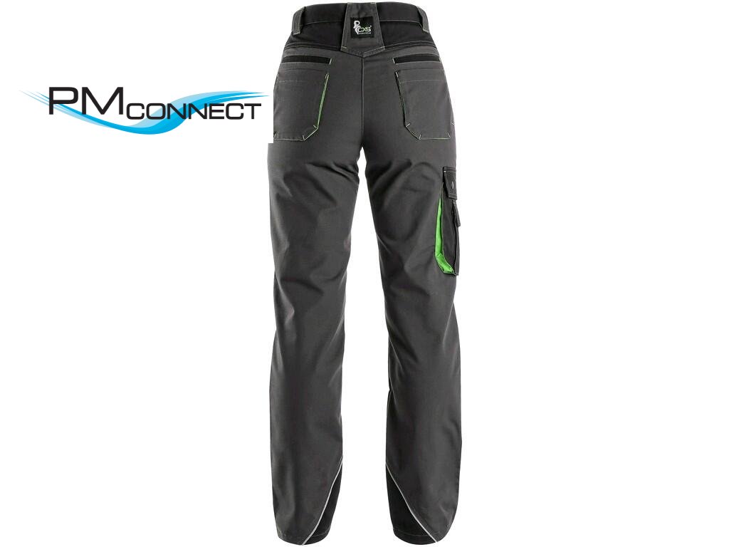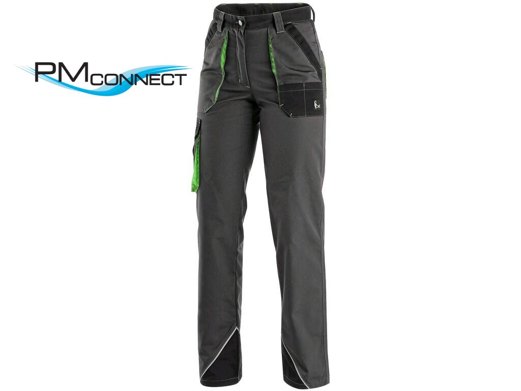 Dámské montérkové kalhoty, pas s poutky na opasek, pas na bocích do gumy (od velikosti 50), přední vakové kapsy, boční multifunkční kapsa, zadní dvojité kapsy, reflexní doplňky. Doporučené použití: stavebnictví, strojírenství, lehký průmysl, automobilový průmysl, logistika, skladová manipulace, spedice, autoservisy, údržba, montáže, zemědělství, zahrada, hobby.Doplňkové parametry