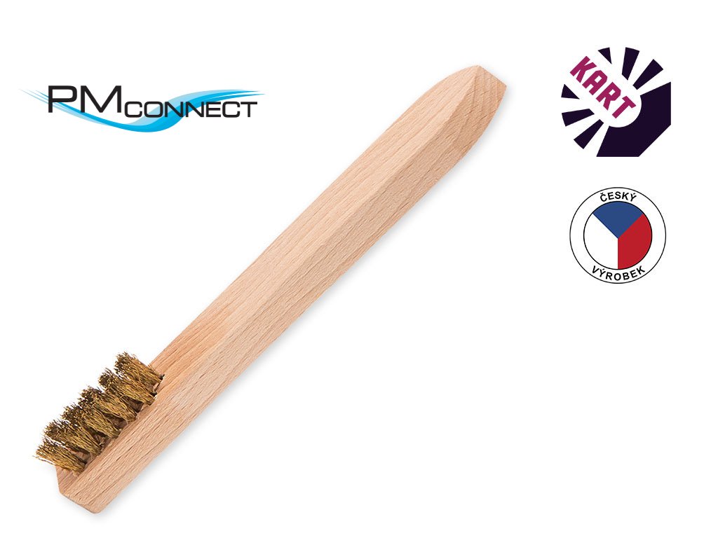 Ruční kartáč s krátkou dřevěnou rukojetí tzv. "mazáček", osazený vlnitým mosazným drátem o průměru 0,25 mm, ve 3 řadách.