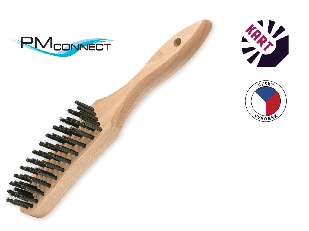 Ruční kartáč se zahnutou dřevěnou rukojetí, osazený hladkým ocelovým drátem o průměru 0,30 mm.