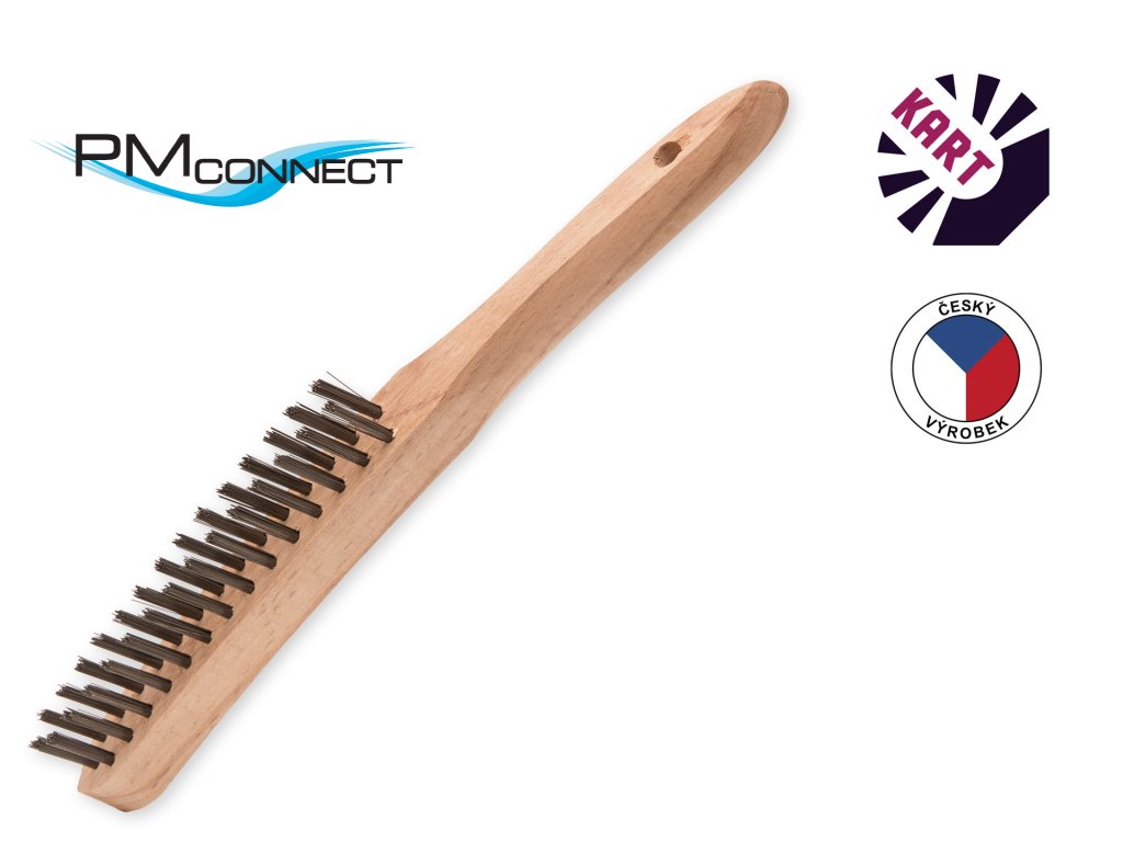 Ruční kartáč se zahnutou dřevěnou rukojetí, osazený hladkým ocelovým drátem o průměru 0,30 mm.