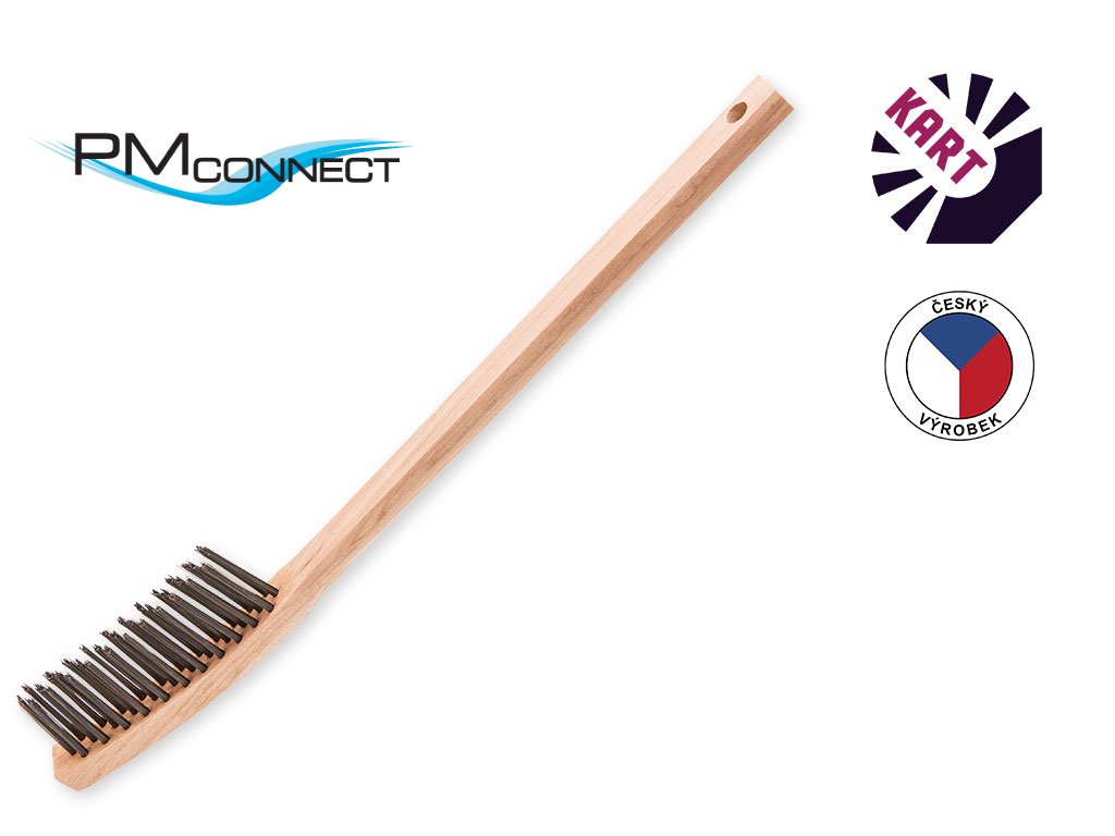 Ruční kartáč se zahnutou dřevěnou rukojetí, tzv. radiátorový, osazený hladkým ocelovým drátem o průměru 0,30 mm.