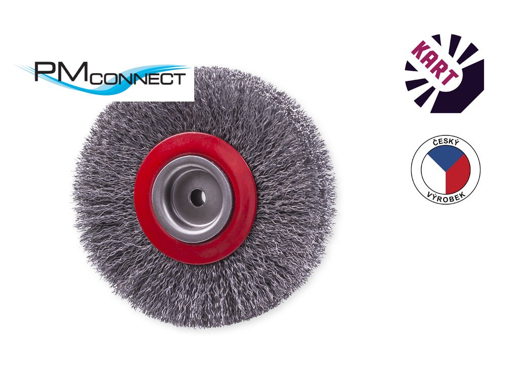 Kotoučový kartáč o průměru 120 mm, osazený vlnitým ocelovým drátem o průměru 0,45 mm, s upínacím otvorem o průměru 8 mm.
