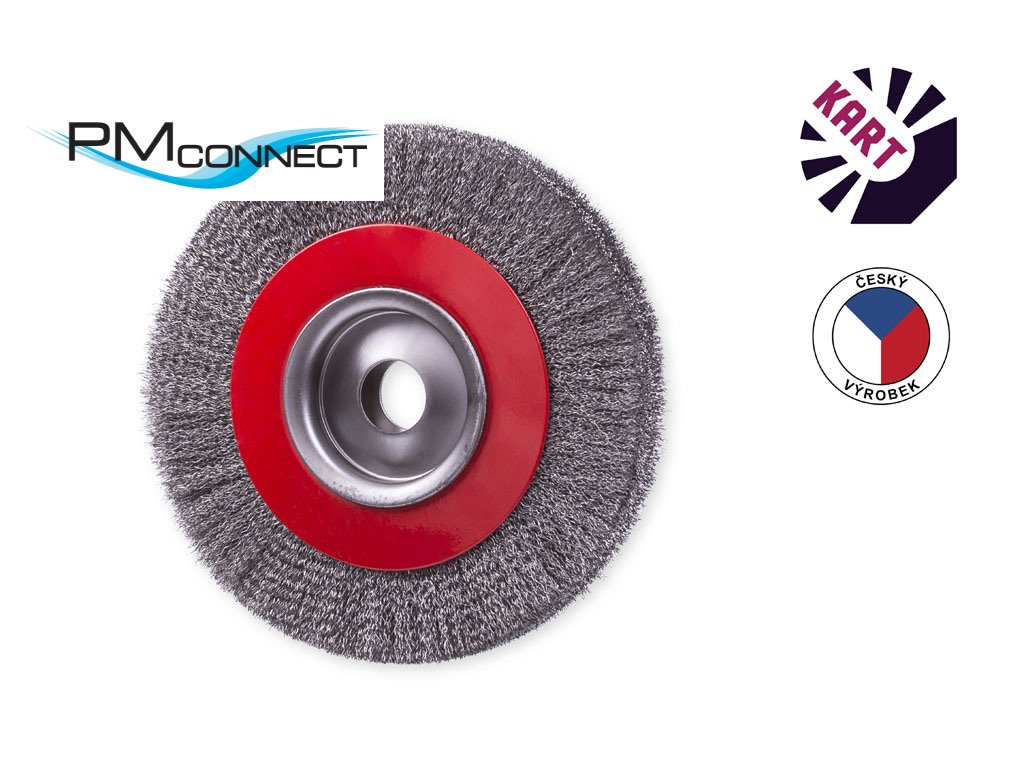 Kotoučový kartáč o průměru 150 mm, osazený vlnitým ocelovým drátem o průměru 0,45 mm, s upínacím otvorem o průměru 20 mm.