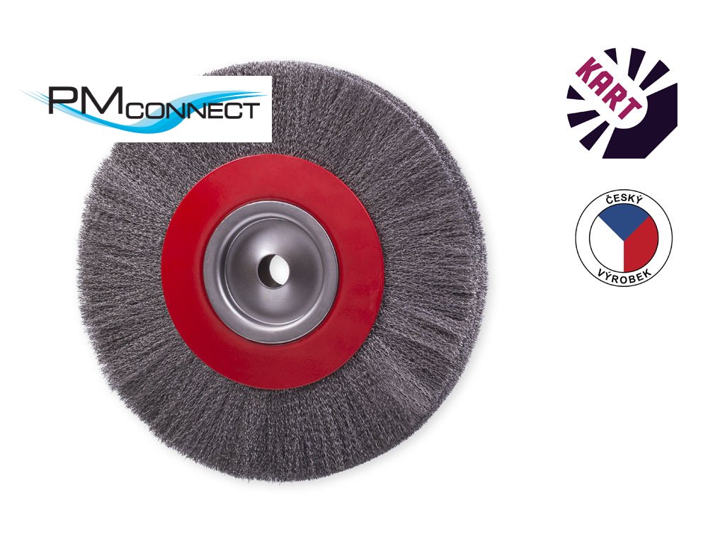 Kotoučový kartáč o průměru 300 mm, osazený vlnitým ocelovým drátem o průměru 0,30 mm, s upínacím otvorem o průměru 20 mm.