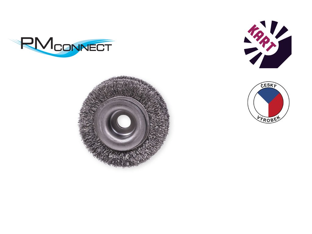 Kotoučový kartáč o průměru 50 mm, osazený vlnitým ocelovým drátem o průměru 0,20 mm, s upínacím otvorem o průměru 8 mm.