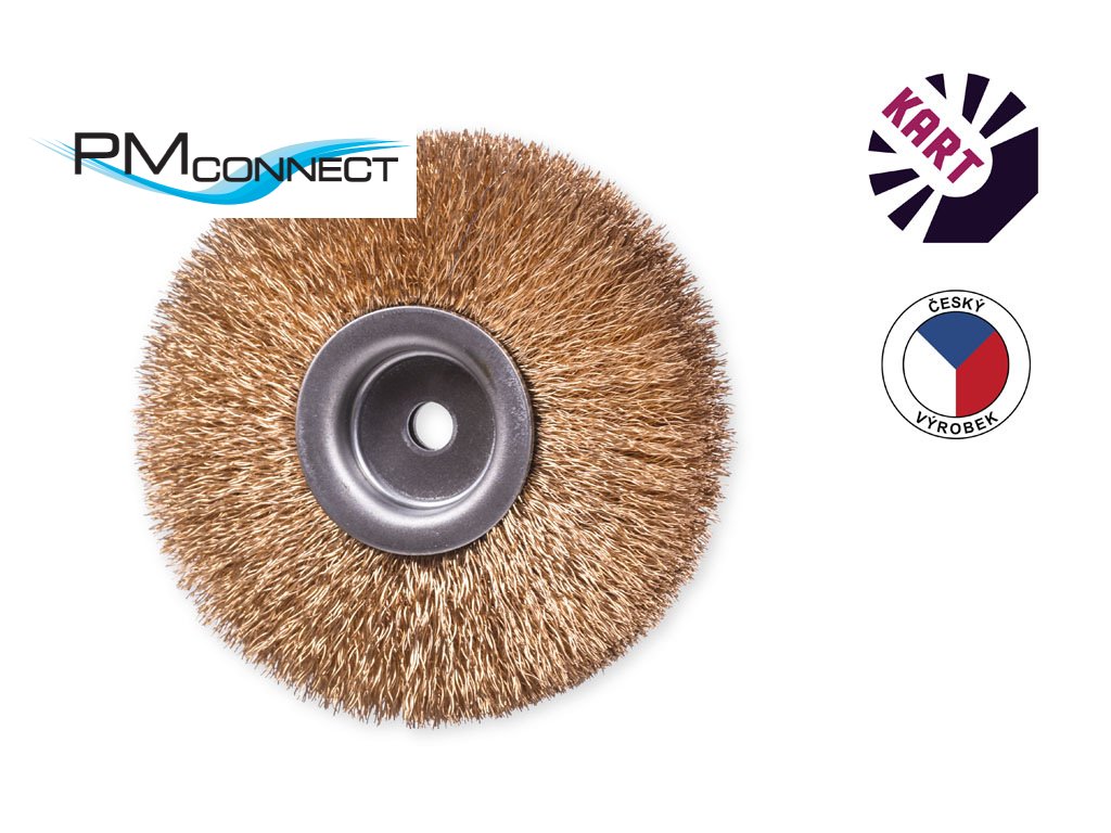 Kotoučový kartáč o průměru 100 mm, osazený vlnitým bronzovým drátem o průměru 0,25 mm, s upínacím otvorem o průměru 8 mm.
