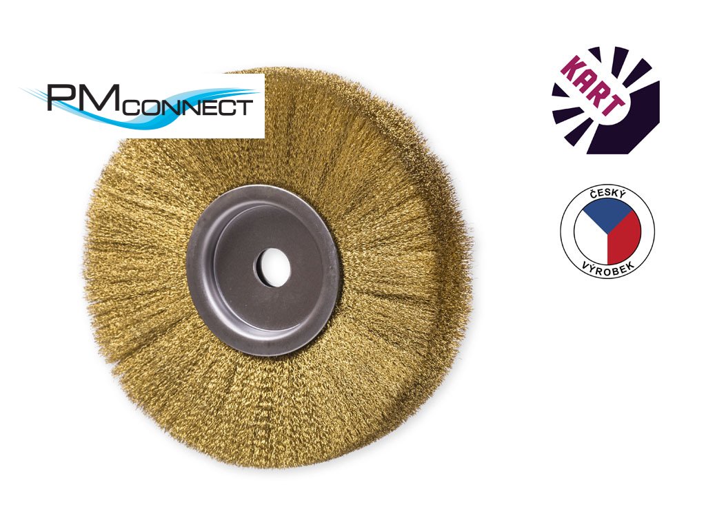 Kotoučový kartáč o průměru 200 mm, osazený vlnitým mosazným drátem o průměru 0,20 mm, s upínacím otvorem o průměru 20 mm.