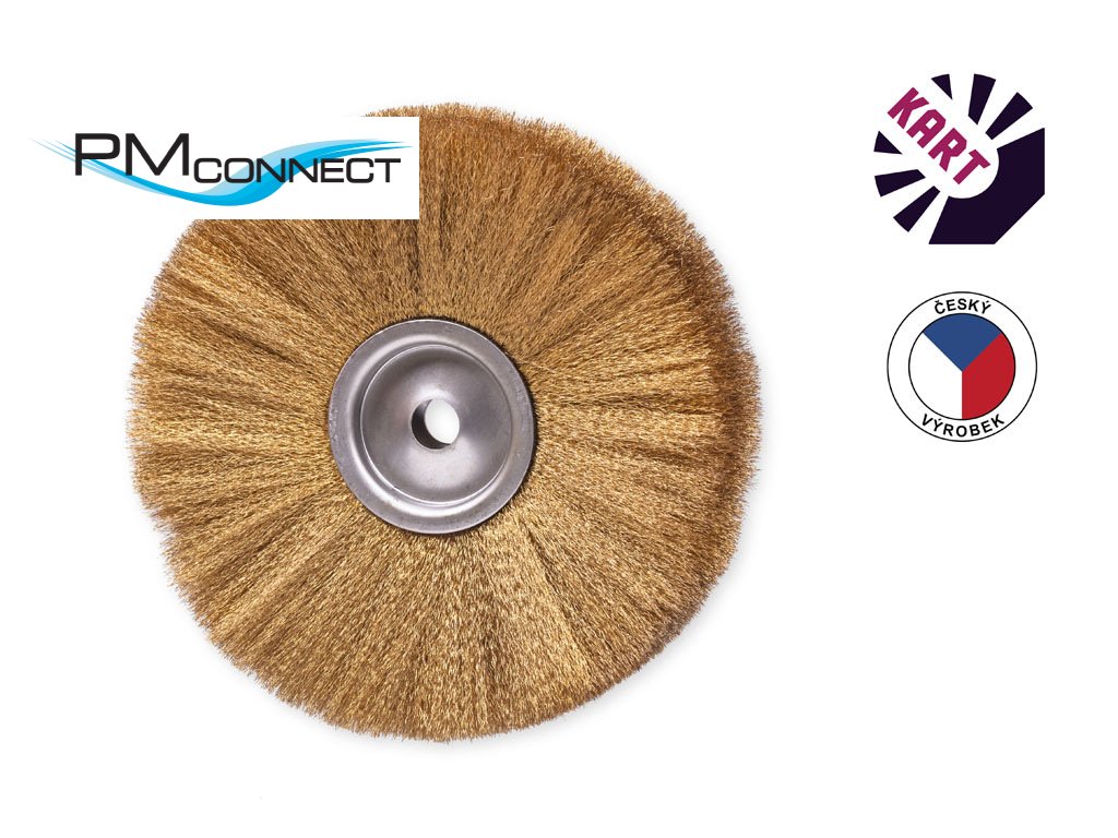 Kotoučový kartáč o průměru 250 mm, osazený vlnitým bronzovým drátem o průměru 0,25 mm, s upínacím otvorem o průměru 20 mm.