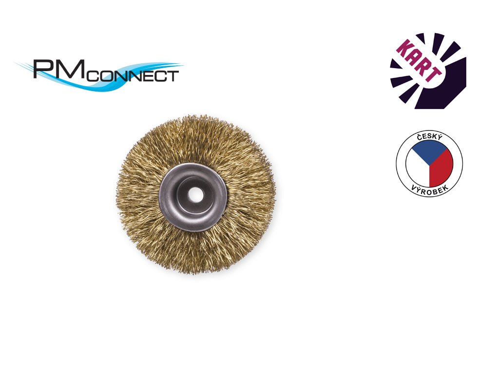 Kotoučový kartáč o průměru 60 mm, osazený vlnitým mosazným drátem o průměru 0,15 mm, s upínacím otvorem o průměru 8 mm.