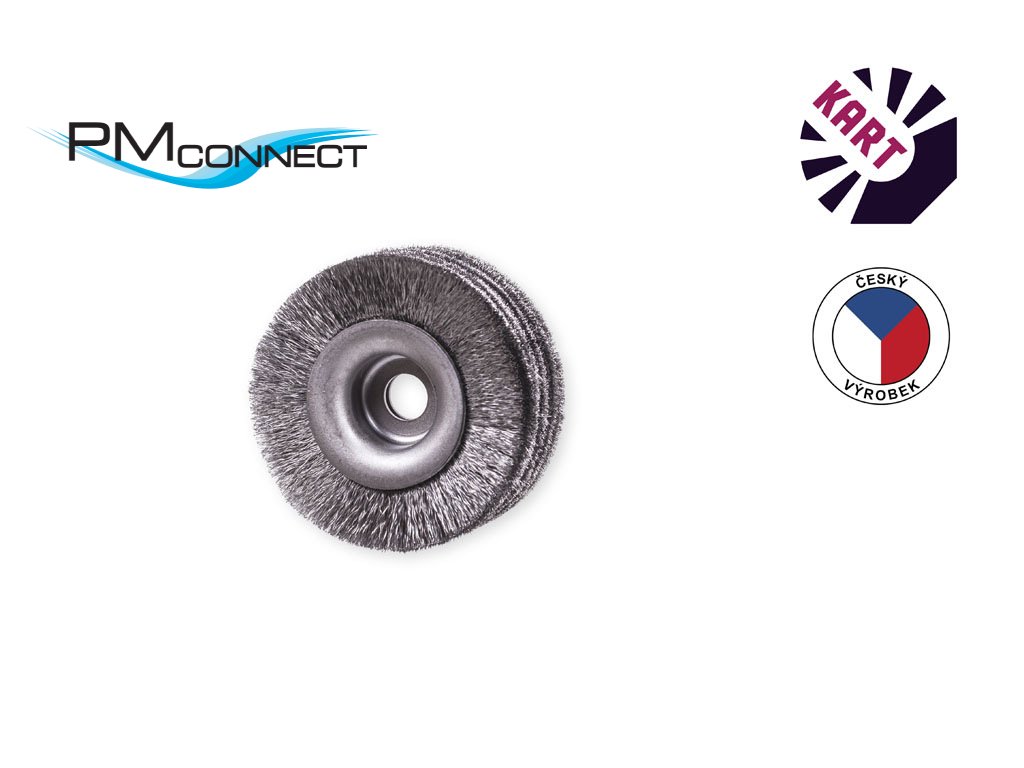Kotoučový kartáč o průměru 70 mm, osazený vlnitým ocelovým drátem o průměru 0,10 mm, s upínacím otvorem o průměru 8 mm.