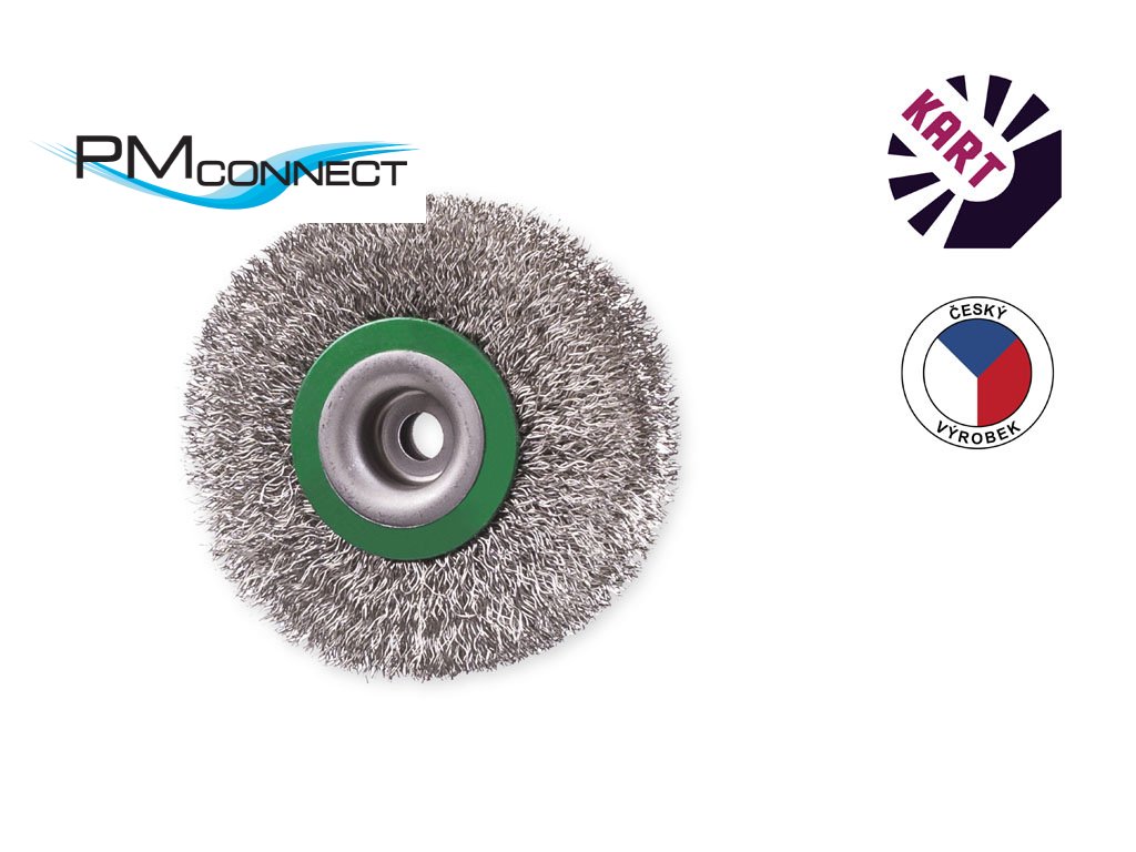 Kotoučový kartáč o průměru 80 mm, osazený vlnitým nerezovým drátem o průměru 0,30 mm, s upínacím otvorem o průměru 8 mm.