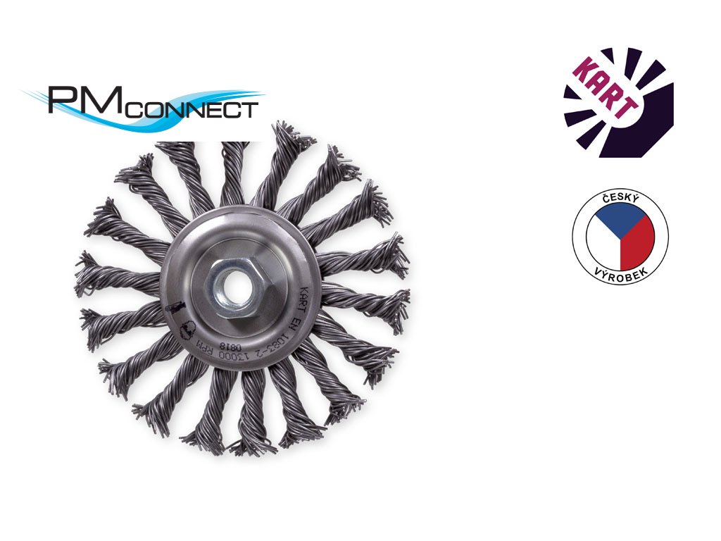 Radiální copánkový kartáč o průměru 125 mm, osazený hladkým ocelovým drátem o průměru 0,80 mm, s upínacím závitem M14.