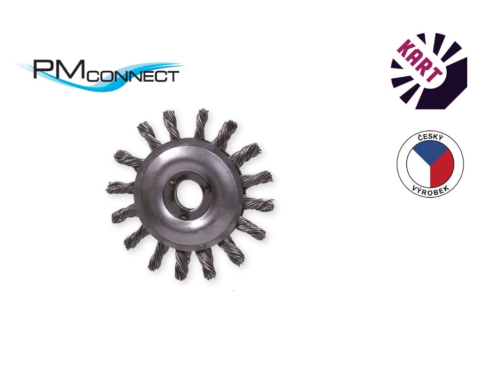 Radiální copánkový kartáč o průměru 75 mm, osazený hladkým ocelovým drátem o průměru 0,60 mm, s upínacím otvorem o průměru 13 mm.