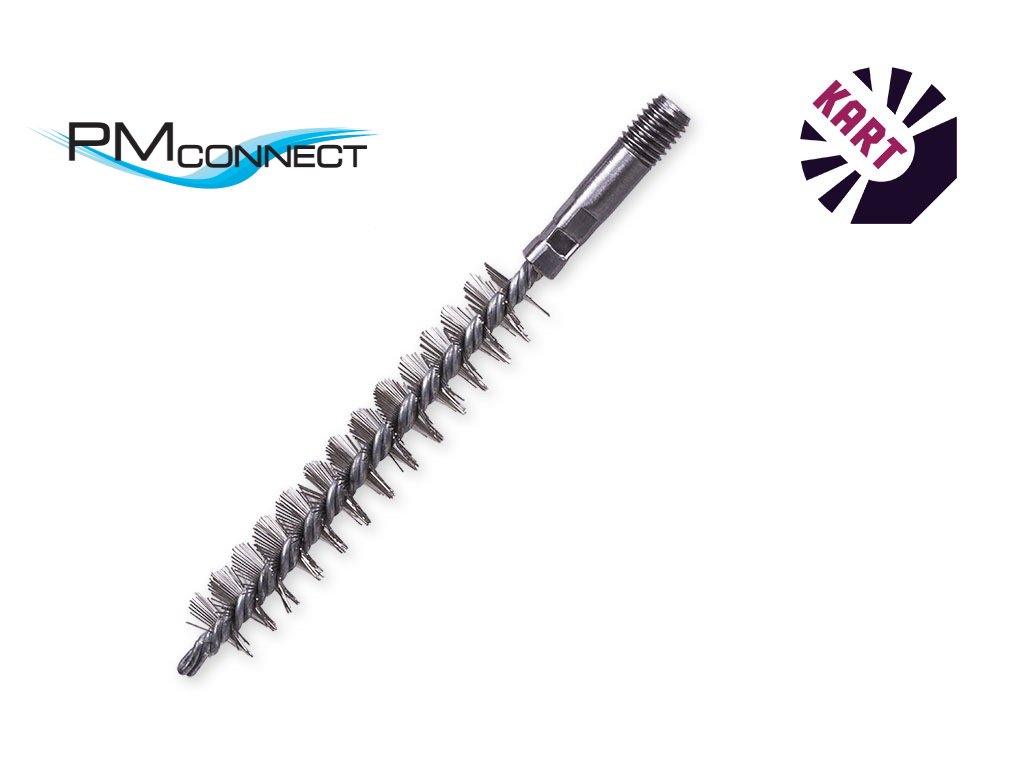 Rourový kartáč o průměru 14 mm, závitem M10 je osazen hladkým nerezovým drátem o průměru 0,40 mm.