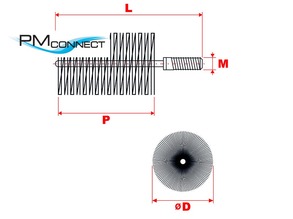 Rourový kartáč o průměru 65 mm, závitem M12 je osazen hladkým ocelovým drátem o průměru 0,40 mm.
