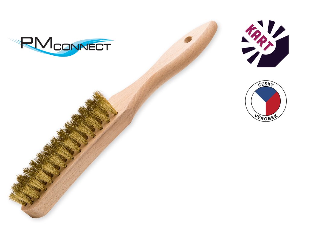 Ruční kartáč se zahnutou dřevěnou rukojetí, osazený vlnitým mosazným drátem o průměru 0,25 mm, ve 4 řadách.