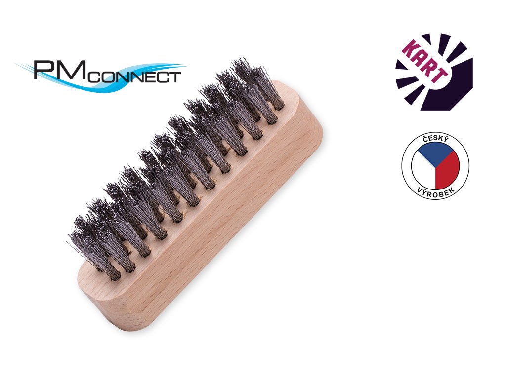 Ruční dřevěný kartáček, určený pro čištění semiše, osazený vlnitým ocelovým drátem o průměru 0,25 mm s krátkým střihem.