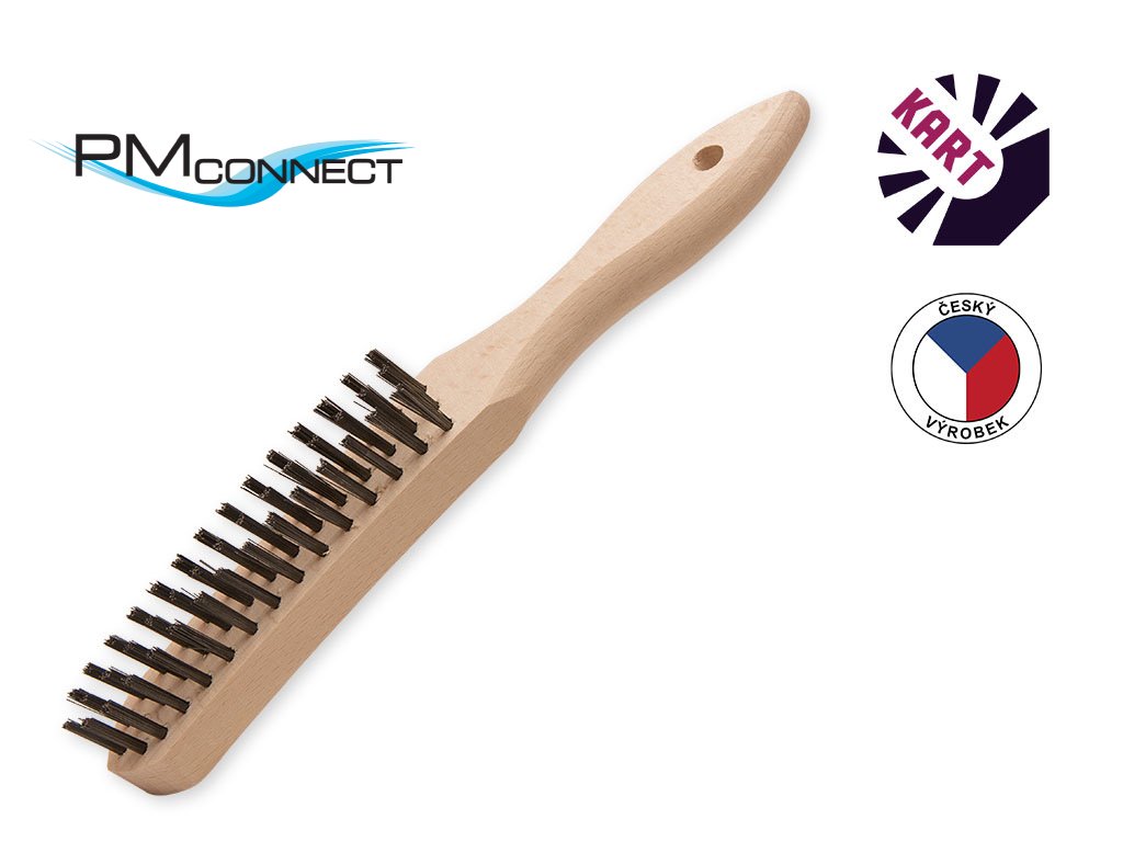 Ruční kartáč se zahnutou dřevěnou rukojetí, osazený hladkým ocelovým drátem o průměru 0,30 mm.