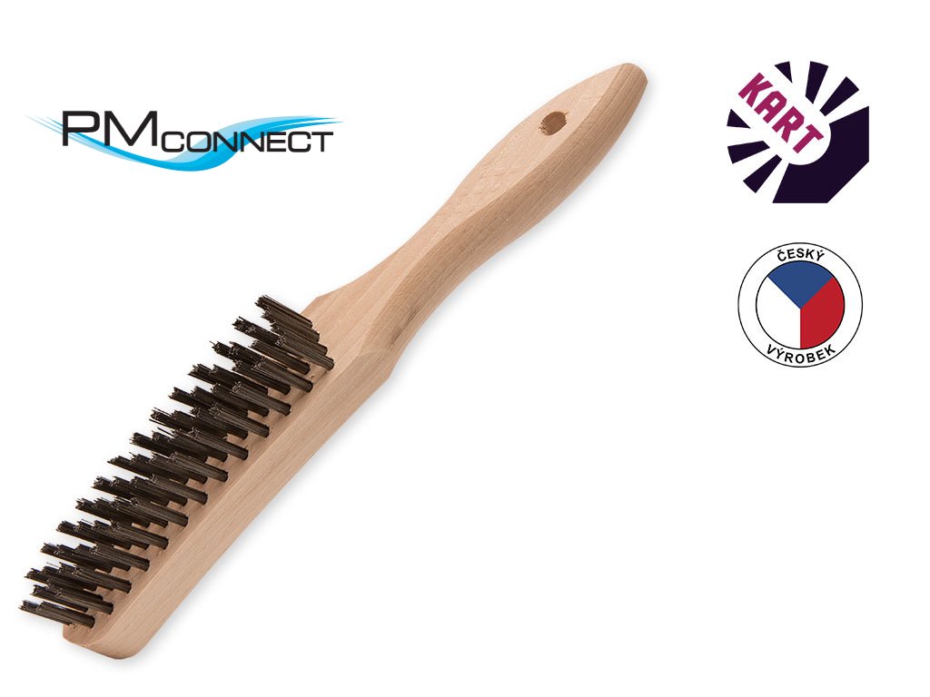 Ruční kartáč se zahnutou dřevěnou rukojetí, osazený polyamidovým (nylonovým) vláknem o průměru 0,50 mm, ve 4 řadách.