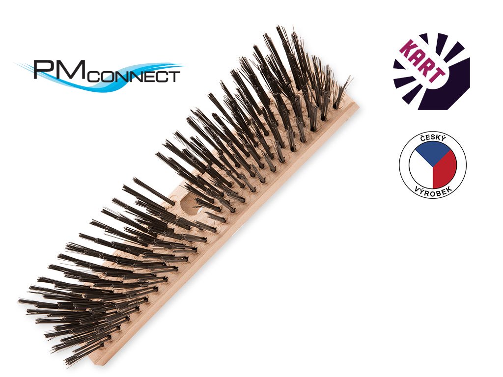 Silniční kartáč s otvorem pro připevnění na násadu, osazený hladkým ocelovým drátem o průměru 0,40 mm, v 6ti řadách.