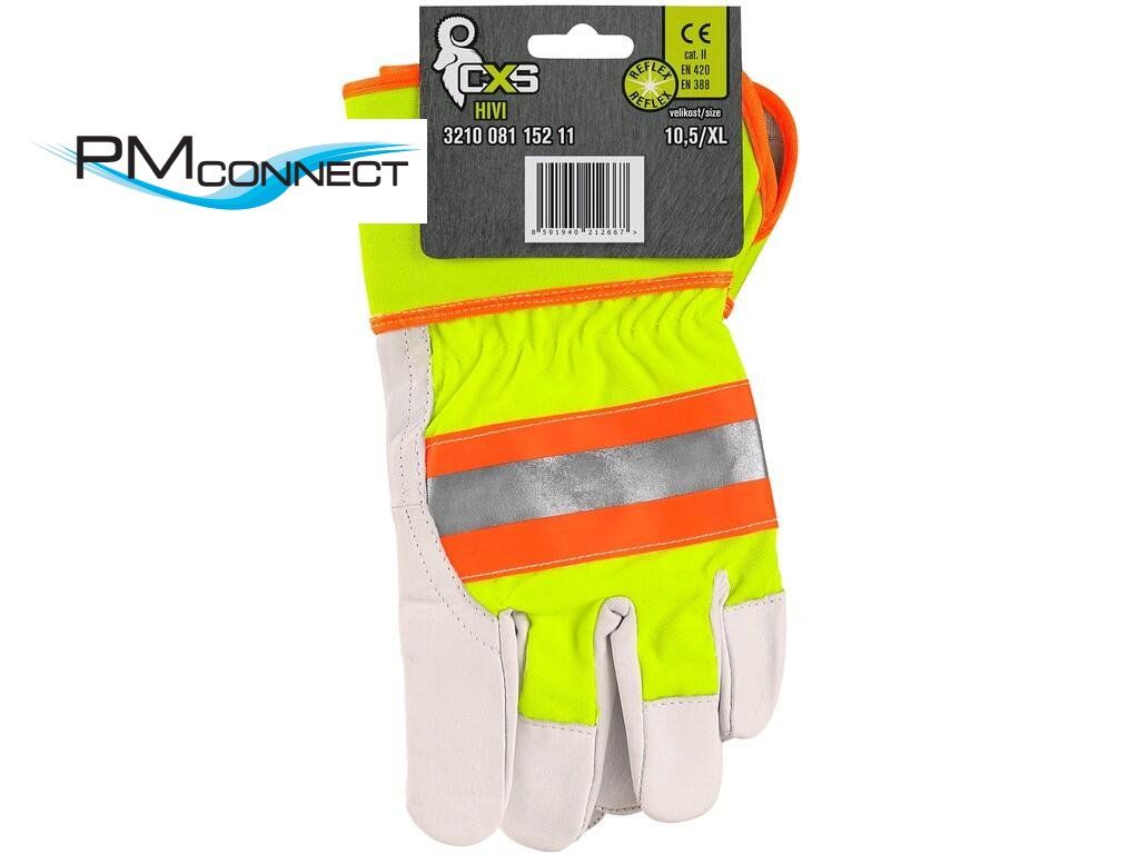 Kombinované rukavice, žluto-oranžové s reflexním doplňkem. Kovové očko v manžetě pro zachycení na karabinu. Baleny s blistrem. Doporučené aplikace: logistika, lehký průmysl, hobby, autoservisy, stavebnictví.Doplňkové parametry