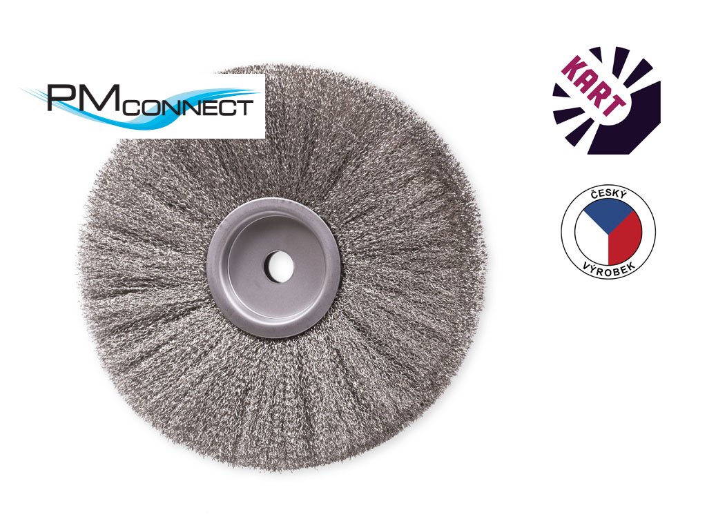 Kotoučový kartáč o průměru 250 mm, osazený vlnitým nerezovým drátem o průměru 0,30 mm, s upínacím otvorem o průměru 20 mm.