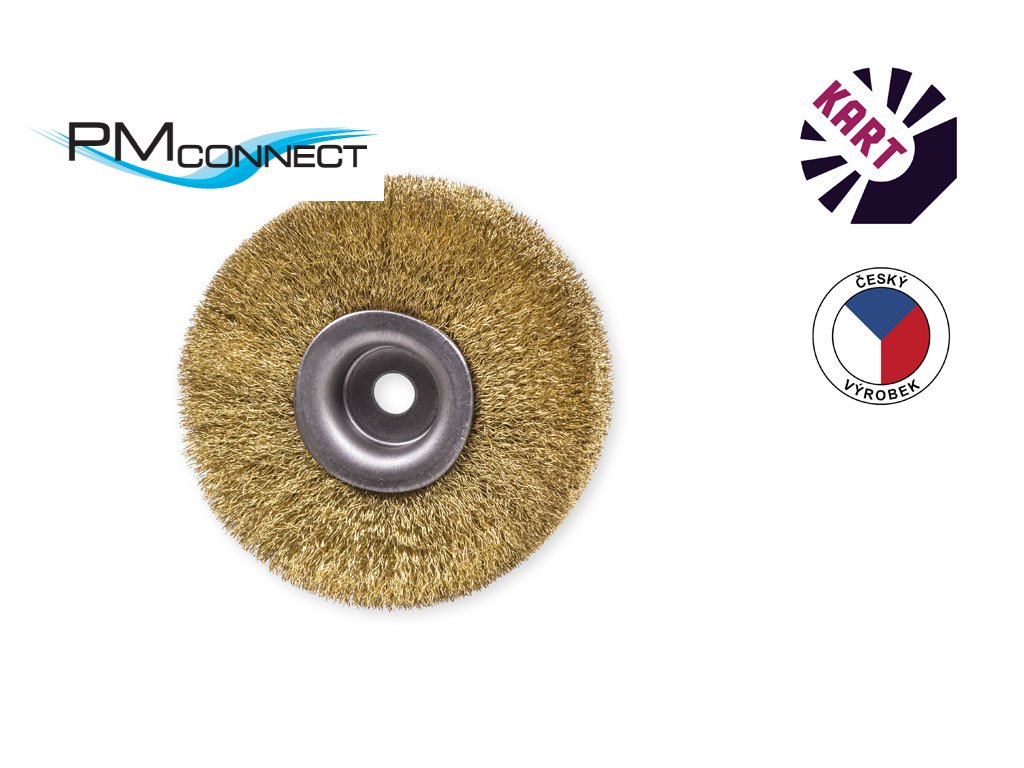 Kotoučový kartáč o průměru 80 mm, osazený vlnitým mosazným drátem o průměru 0,25 mm, s upínacím otvorem o průměru 8 mm.