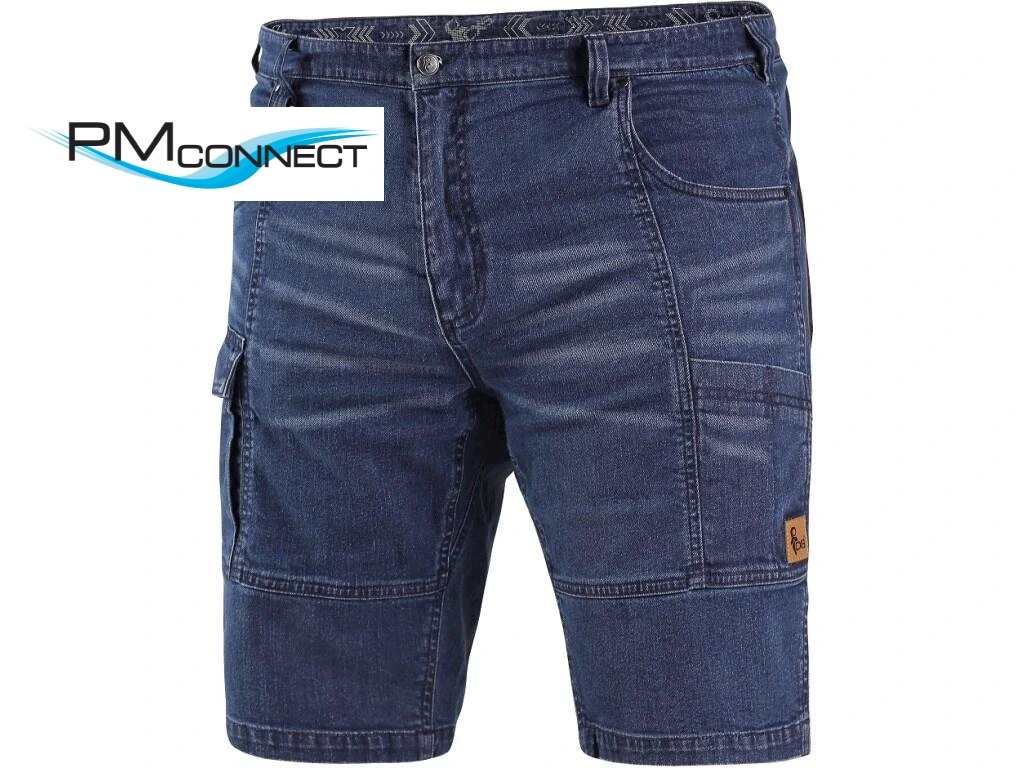 Pánské džínové kraťasy, pas s poutky na opasek a plastovým přívěskem, 2 přední kapsy, 2 zadní kapsy z materiálu CORDURA, boční multifunkční kapsy, na pravé kapse poutko pro kladivo.