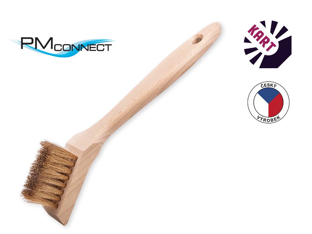 Ruční drátěný kartáč se zahnutou dřevěnou rukojetí osazený vlnitým bronzovým drátem o průměru 0,15 mm, ve 4 řadách