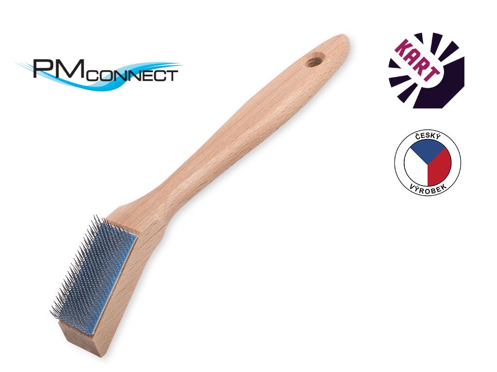 Zahnutý ruční kartáč s dřevěnou rukojetí,osazený ocelovým drátem o průměru 0,30 mm, na prošívaném kaučuko-bavlněném popruhu o šířce 25 mm.
