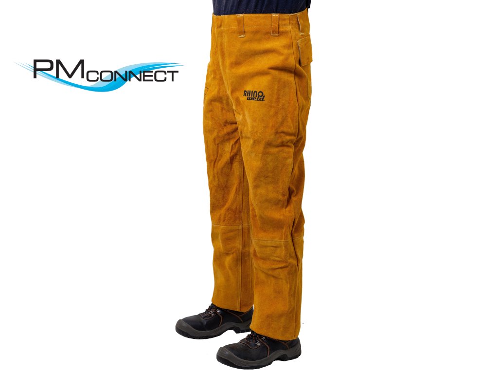 RHINOweld – celokožené kalhoty pro svářeče vhodné k uvedeným kabátům, oděruvzdorné, hovězinová štípenka. Kompletně šité KEVLAROVOU nití, se dvěma bočními kapsami s přístupem z boku, sedmi poutky na pásek a vyztuženými namáhanými partiemi.