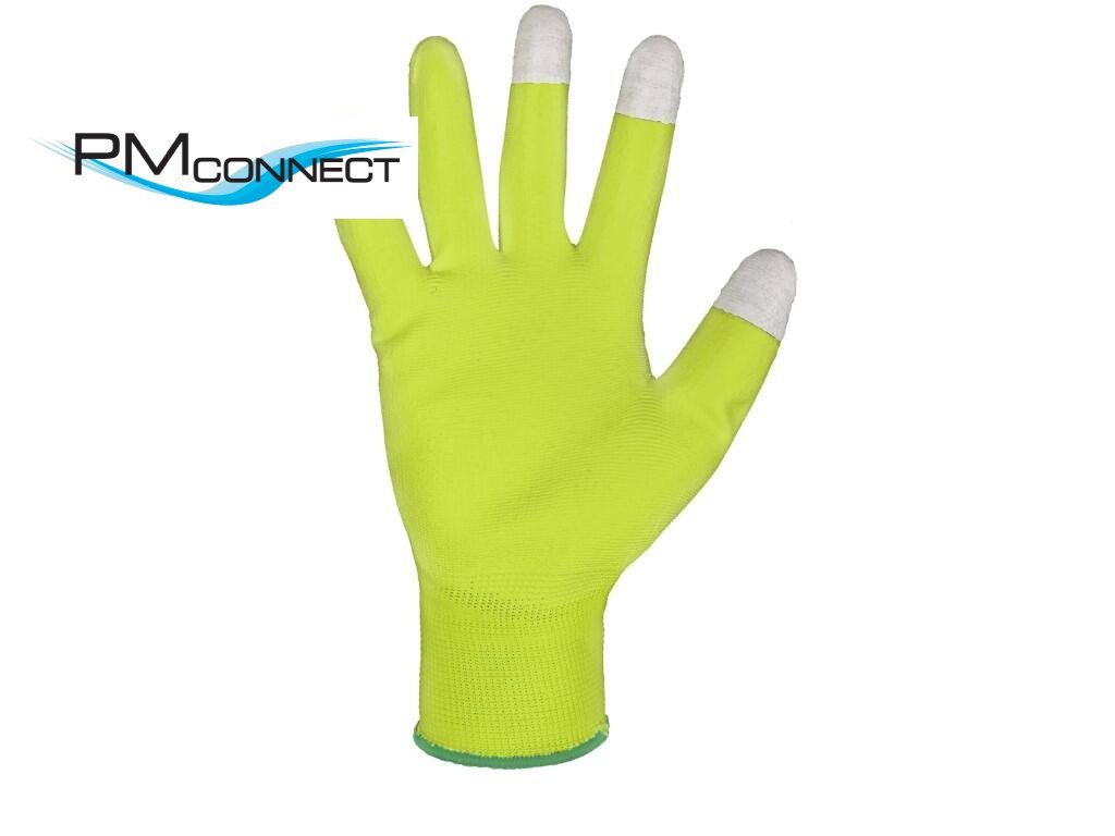 Pletené bezešvé rukavice, dlaně a prsty povrstveny polyuretanem, pružná manžeta. V koncích palce, ukazováčku a prostředníčku měděné vlákno pro práci s dotykovými displeji. Baleny s blistrem. Doporučené aplikace: automobilový průmysl, elektronika, logistika, skladování, montáž a balení malých součástek, zahrada, lehké montáže.Doplňkové parametry
