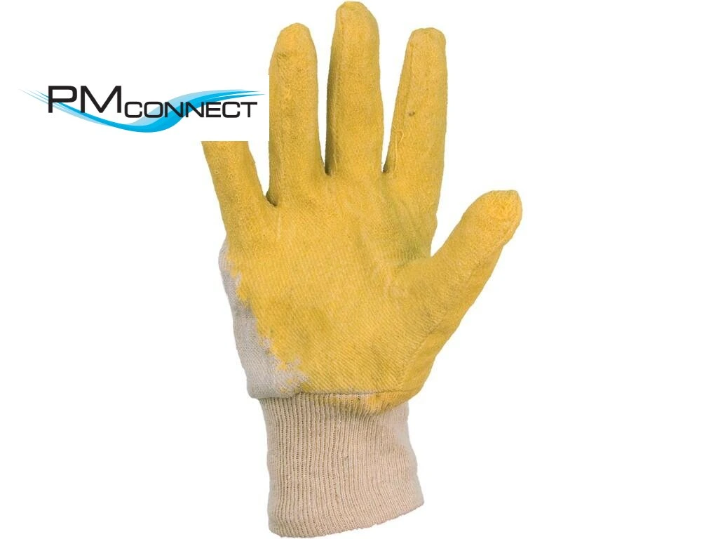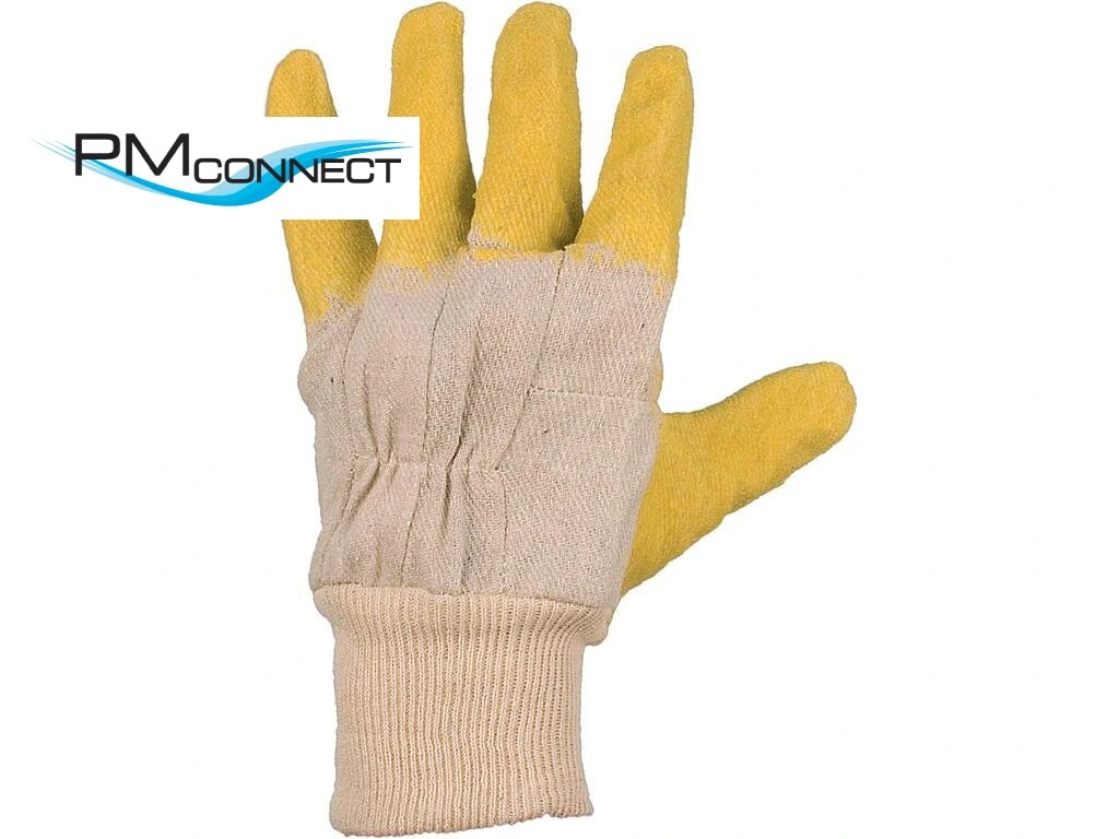 Rukavice s dlaněmi a prsty máčenými ve žlutém latexu se zdrsnělým povrchem pro lepší úchop, úpletová manžeta. Doporučené aplikace: stavebnictví, zahrada, hobby, zemědělství.Doplňkové parametry