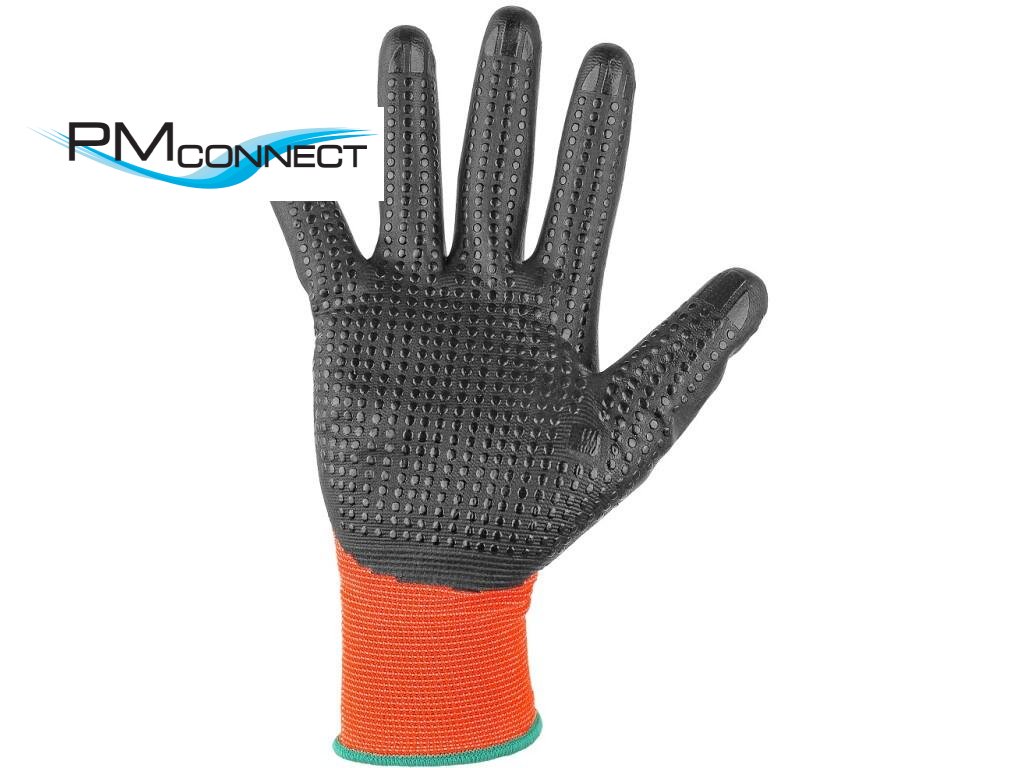 Bezešvé rukavice s dlaněmi a prsty povrstvenými do 3/4 nitrilem s prodyšnou úpravou, PVC terčíky pro lepší úchop a manipulaci. Doporučené aplikace: automobilový průmysl, logistika, skladování, hobby, práce s kluzkými předměty, zemědělství.Doplňkové parametry