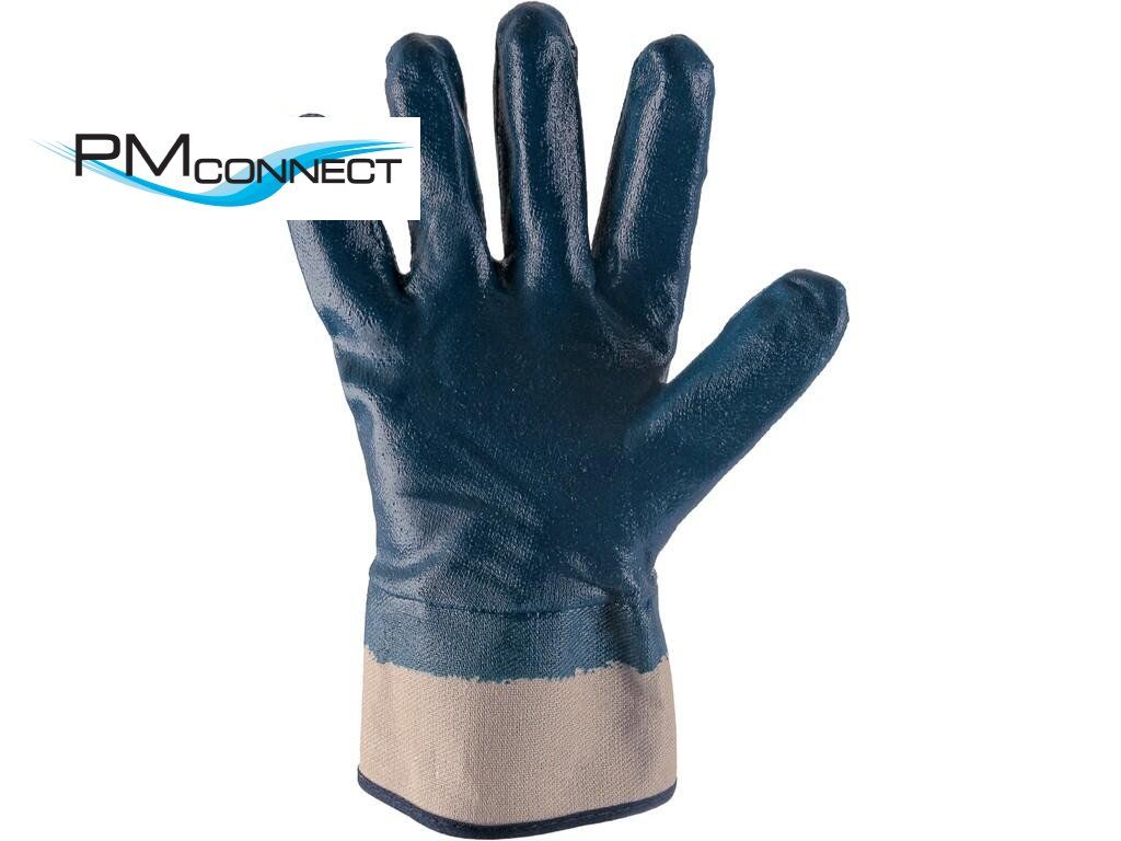 Rukavice máčené v modrém nitrilu s pevnou manžetou. Doporučené aplikace: stavebnictví, vlhké prostředí, zemědělství, sběr odpadu, vodovody a kanalizace.Doplňkové parametry
